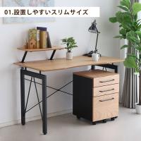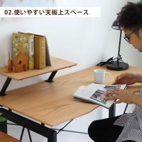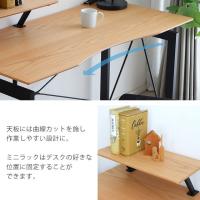 天板は曲線カットを施し、作業がしやすい設計。デスクに取り付けの小棚はお好みの位置に固定できます。