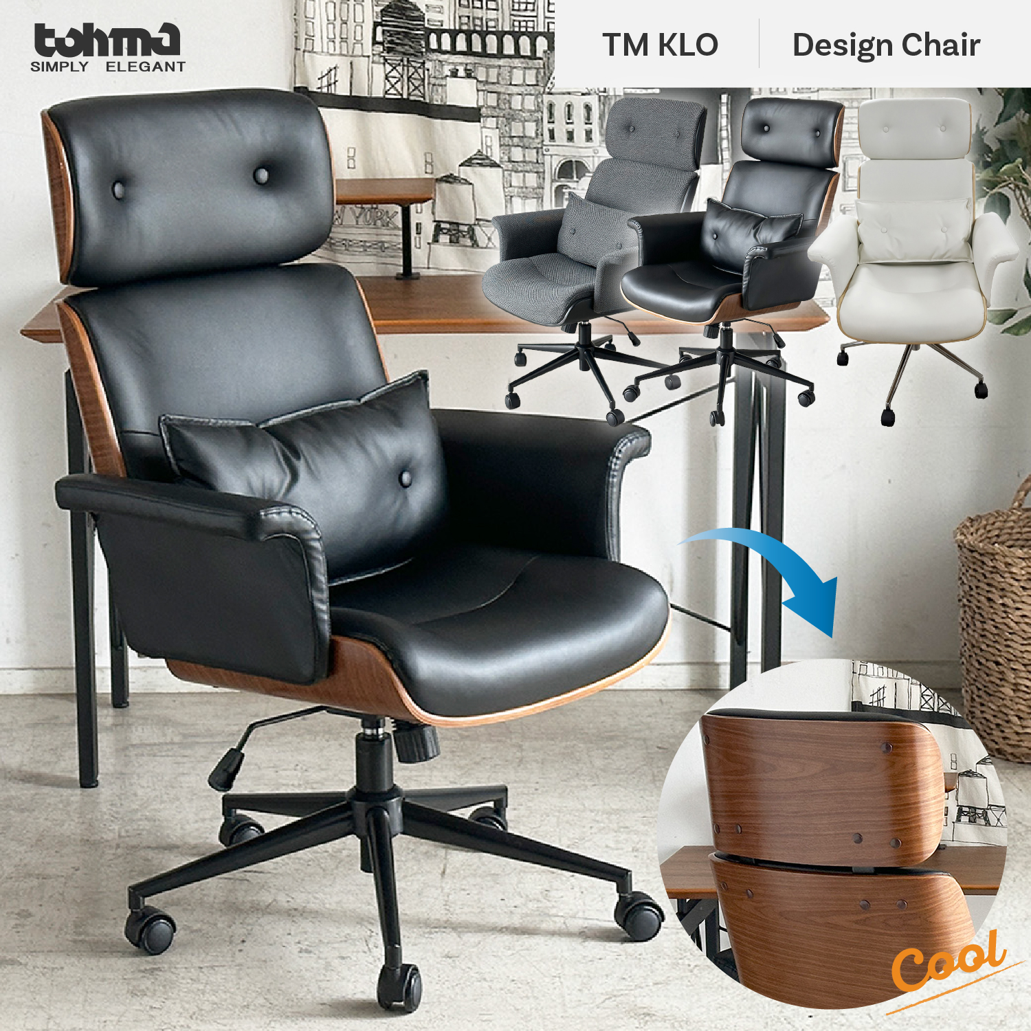 丸みを帯びた曲木と合成皮革の組合せが、シックでレトロなオフィスチェア