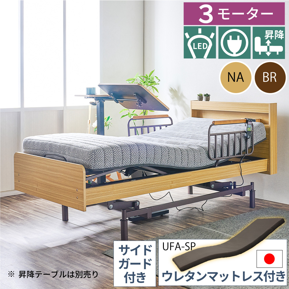電動ベッド 介護用ベッド 昇降式 3モーター MFB-1603UF キャスターなし 非課税 介護 棚付き 宮付き 国産ウレタンマットレス LEDライト コンセント付き 高さ調整