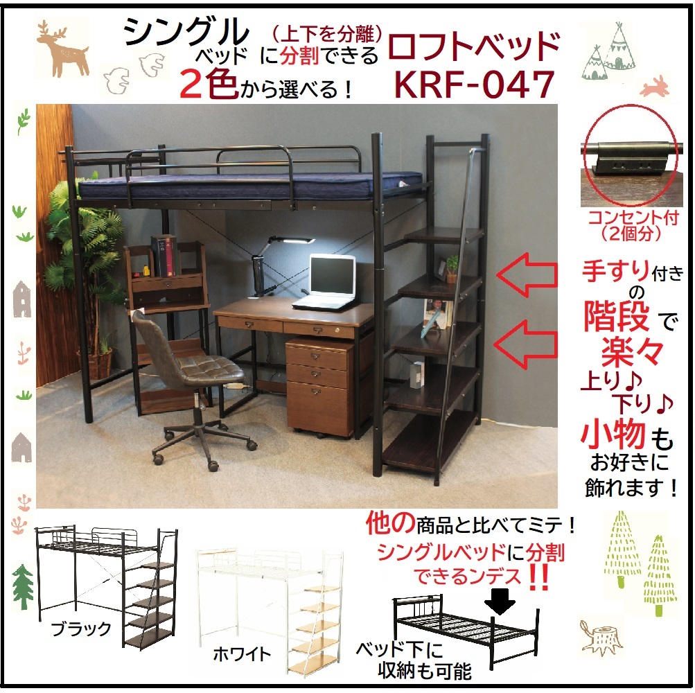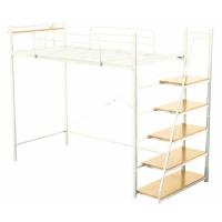 ロフトベッド 階段書棚付きロフトベッド ハンガーバー付 スチール パイプベッド 分割可能 階段付き コンセント付き ブラック ホワイト 収納付階段 シンプル