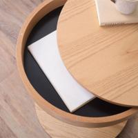 天板下に収納スペースがある丸型のサイドテーブル。