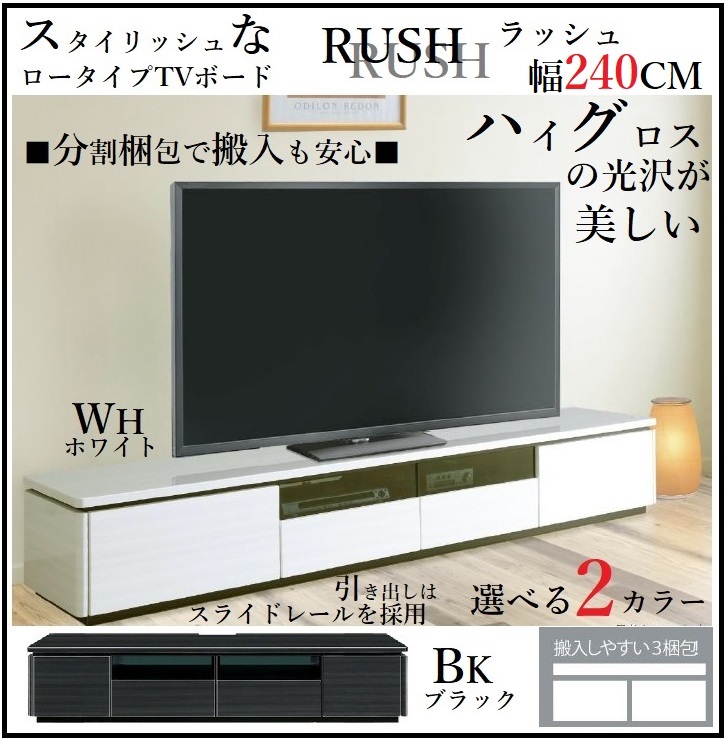 ローボード 幅240 テレビボード テレビ台 おしゃれ コンセント付き スタイリッシュ ハイグロス UV塗装 TVボード ホワイト ブラック RUSH ラッシュ