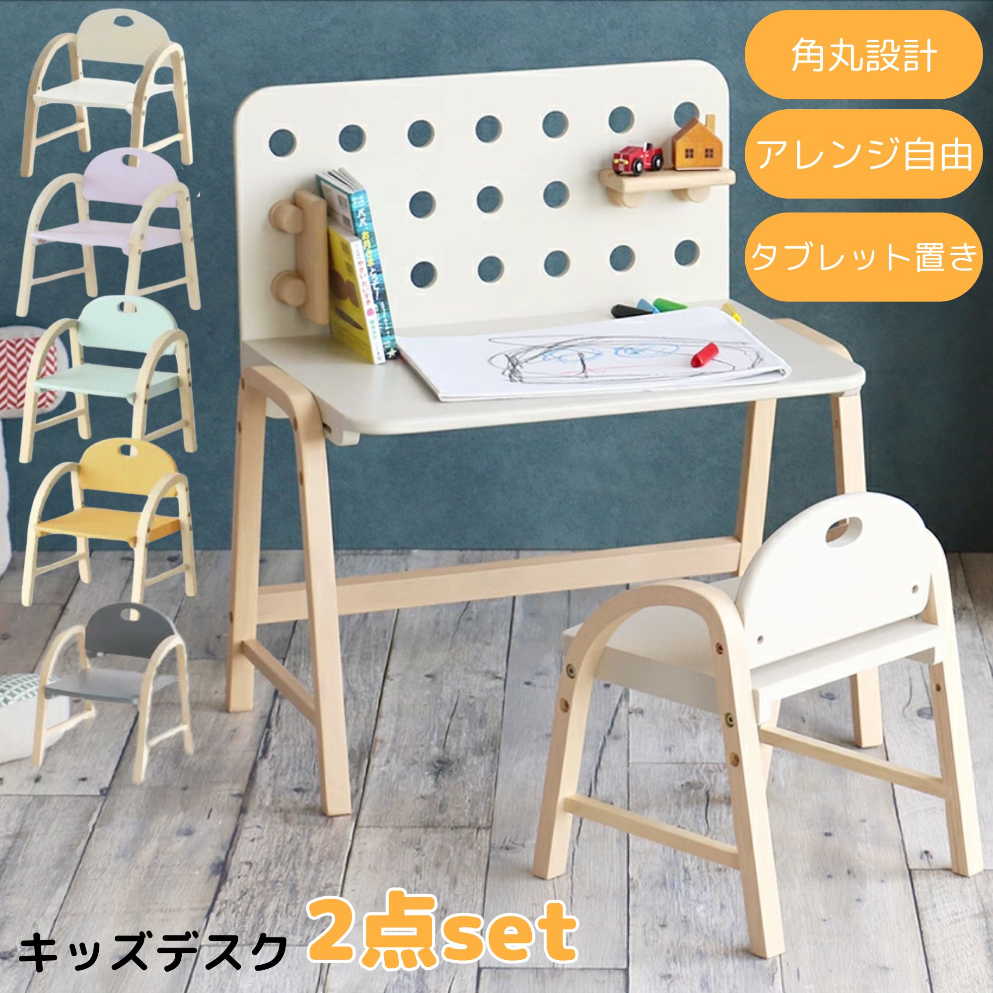 子どもの“はじめての机”にぴったりなデスクと、カラバリ豊富な木製キッズチェアの2点セットです。