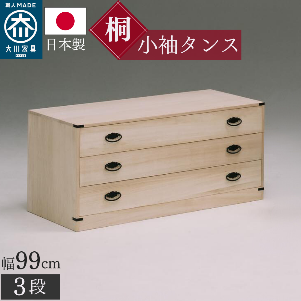 桐箪笥職人が作るこだわり 桐 小袖タンス 3段 日本製 完成品 調湿 防カビ 防虫 安心 幅99cm 奥行44 高さ45 和ダンス 着物収納 帯 チェスト ロー ワイド 着物
