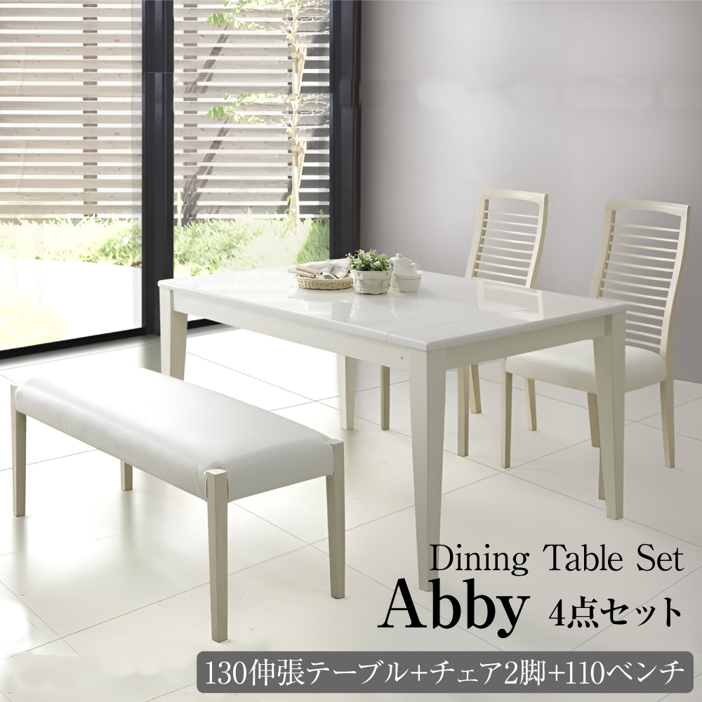 ダイニングセット 4点セット アビー 伸長式テーブル 幅130 150 160 180cm 伸張式 調整 ベンチ 110cm ダイニングチェア 2脚 4人用 鏡面 ホワイト 白 北欧 食卓