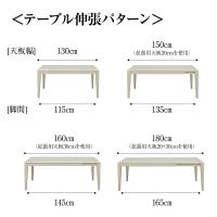 ●テーブルは伸張式で幅130cmから拡張用の天板20cmと30cmの2枚を使い、150cm、160cm、180cmと用途に合わせて4段階に調節できます