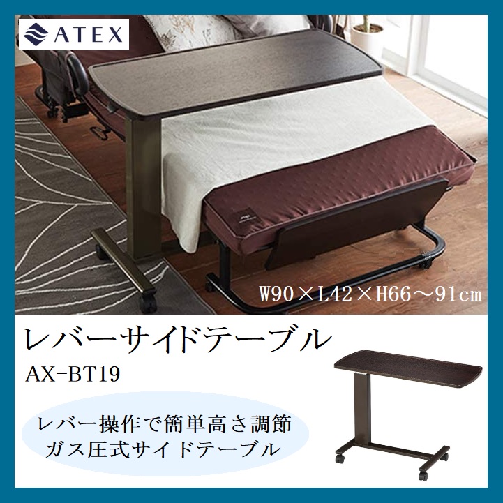 ベッドサイドテーブル AX-BT19 ガス圧式 高さ調節 ATEX アテックス 昇降テーブル サイドテーブル レバー操作 介護テーブル ベッドテーブル キャスター