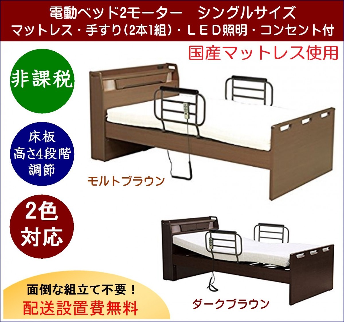 開梱設置付 電動ベッド 介護ベッド 2モーター 家庭用 シングル フレーム 国産マットレス セット MFB-8902 宮付き 棚 ライト 引き出し 手すり付き リクライニング