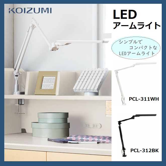 コイズミ LEDアームライト PCL-311WH PCL-312BK デスクライト LED 自然光 学習ライト 卓上ライト 電気 卓上電気 クランプ式 コンパクト 昼白色 電球色
