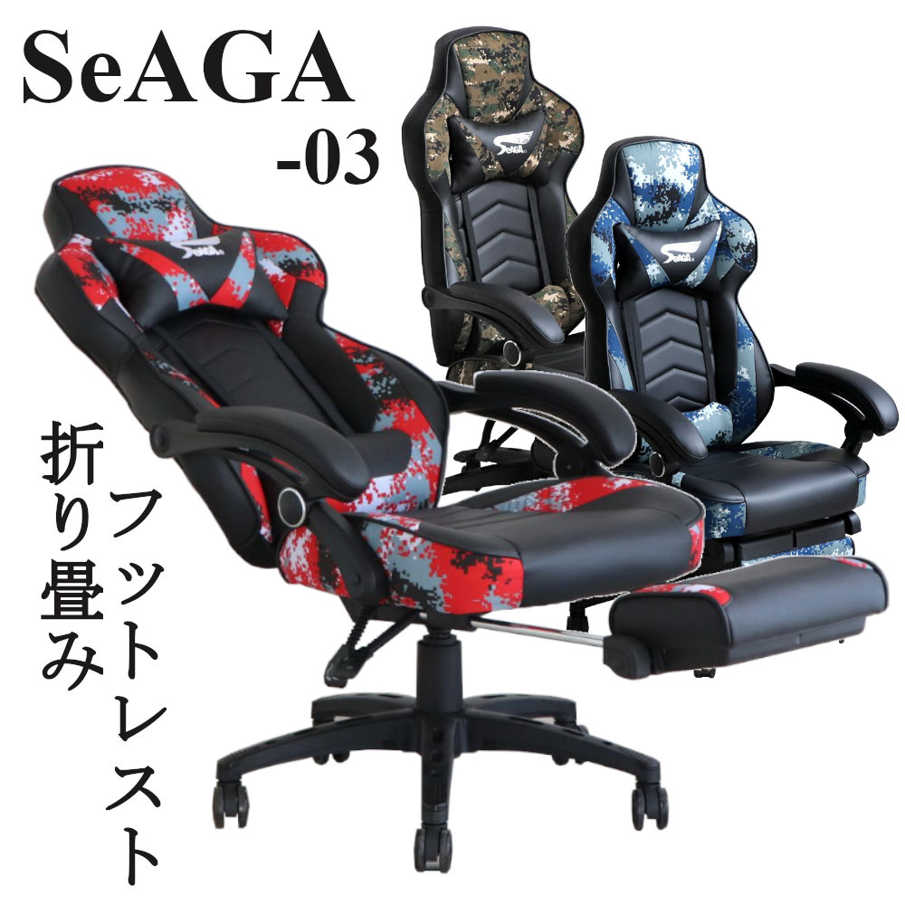 ゲーミングチェア SeAGA-03 収納式 フットレスト アームレスト リクライニング 昇降式 キャスター付 サバイバーチェア パソコンチェア 肘付 e-sports ハイバック