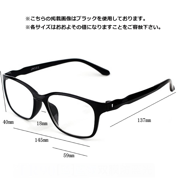 | 素材/材質 | 材質:ポリカーボネート(レンズ) TR90(フレーム) ブルーライトカット率:約~40% 紫外線カット率:約~99% 重量:約18g 度数:+1.0 +1.5 +2.0 +2.5 +3.0 +3.5 +4.0 カラー:ブラック(ツヤ消し) ブラック&ネイビー(ツヤ消し)/ブラック&レッド(ツヤ消し)