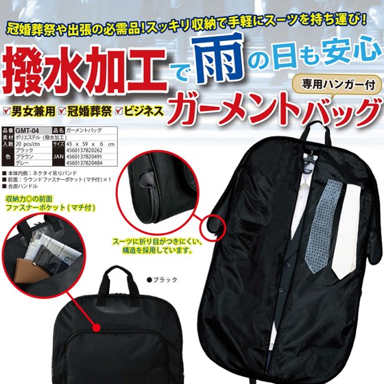 スーツや衣装の持ち運びに!ガーメントバッグ 出張冠婚葬祭 部活 撥水加工 ブラック