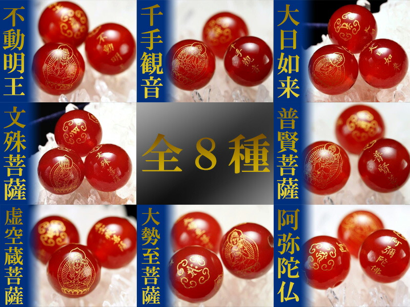 | 梵字&仏彫り珠 全8種 梵字とそれに対応する菩薩、観音、明王の名と像が彫りこまれたビーズ石入荷です!! 1珠にこの3種が彫りこまれた手の込んだ彫り珠です 梵字とは仏教、特に空海、最澄が伝来させた密教と密接な結び付きがあって、紀元前に古代インド文字、サンスクリット語として発展しました。 一字一字が仏を象徴し、生まれ年(干支)によって守護して下さると言われているものが守護梵字です。 梵字を身に着ける事によって神仏の加護を受けられると言われ、人生を歩み続けていく時に降り掛かる様々な苦難から逃してもらえる不思議な力を持ち災いから救ってくださるとも言われています。 普賢菩薩 【アン】 辰(たつ)、巳(へび) 不動明王 【カーン】 酉(とり) 千手観音 【キリーク】 子(ねずみ) 阿弥陀仏 【キリーク】 戌(いぬ)、亥(いのしし) 大勢至菩薩 【サク】 午(うま) 虚空蔵菩薩 【タラーク】 丑(うし)、寅(とら) 大日如来 【バン】 未(ひつじ)、申(さる) 文珠菩薩 【マン】 卯(うさぎ) |