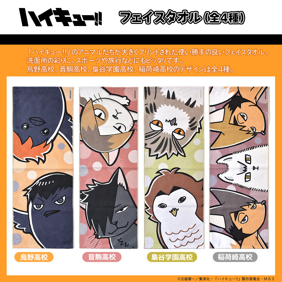 ハイキュー グッズ 公式 フェイスタオル 全4種 烏野高校 音駒高校 梟谷学園高校 稲荷崎高校 (お一人様各2点限り)