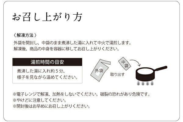 「料亭のすりながし」は、日々変化する気候等の影響により規格外品として扱われて無価値化してしまう食材を、料理人が磨きをかけることでおいしくて身体にやさしい商品として生まれました。 ![]() 全ての味をお愉しみいただける詰合せにいたしました。目上の方への贈り物にもおすすめな専用化粧箱入りです。ご自宅用にはもちろん、贈答用としてもお喜びいただけます。 野菜と出汁を愉しむ一杯 素材の自然な美味しさを味わう日本の伝統料理「すりながし」。生産者さまのこだわり野菜を使用し、料理人が作る”特製出汁”をあわせ、口当たり優しく、のどごしなめらかに仕上げました。 ![]() 旨み広がる5つの味わい ![]() こだわりの野菜を使用した5種の味をご用意。全ての味をお愉しみいただける詰合せにいたしました。 ![]() ![]() ![]() ![]() ![]() お召し上がり方 お召し上がり方は、袋のまま湯煎をして器に移すだけ。 ![]() 【注意事項】 ※冷凍便でお届けいたします。常温・冷蔵商品との同梱はいたしかねます。 ※お召し上がり前に解凍方法をご確認くださいませ。 ※熨斗がご入用の方はご注文確認ページからご指示くださいませ。 ※手提げ袋はお付けすることができません。ご了承くださいませ。 仕様 ・セット内容 5袋(かぶら・人参・山芋・小松菜・白ねぎ 各180ml) ・原材料 かぶら 和風だし(こんぶ・かつお)(国内製造)、蕪(千葉県産)、玉ねぎ、米粉(うるち米(国産))、無塩バター、砂糖、クリーム、食塩 人参 和風だし(こんぶ・かつお)(国内製造)、人参(千葉県産)、玉ねぎ、米粉(うるち米(国産))、砂糖、無塩バター、クリーム、食塩 山芋 和風だし(こんぶ、かつお)(国内製造)、やまのいも(千葉県産)、玉ねぎ、砂糖、無塩バター、米粉(うるち米(国産))、クリーム、食塩 小松菜 和風だし(こんぶ・かつお)(国内製造)、小松菜(千葉県産)、玉ねぎ、米粉(うるち米(国産))、砂糖、無塩バター、クリーム、食塩 白ねぎ 和風だし(こんぶ・かつお)(国内製造)、白ねぎ(国産)、玉ねぎ、米粉(うるち米(国産))、無塩バター、砂糖、クリーム、食塩 ・サイズ(箱) 縦252×横428×高さ35(mm) ・特定原材料 一部に乳成分・やまいもを含む ・保存方法 冷凍(-18℃以下)で保存してください。 ・解凍後の賞味期限 解凍後はお早めにお召し上がりください。 ・賞味期限 製造日より120日間 ※解凍後、常温保管はしないでください。 ※手提げ袋はお付けすることができません。ご了承ください。 |