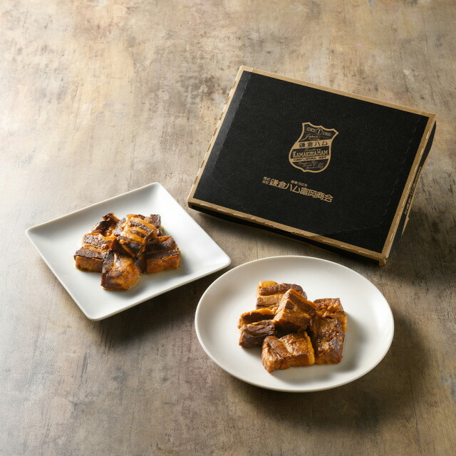 鎌倉ハム富岡商会の鎌倉煮は、豚ばら肉を独自の特製だれで味付けし、肉本来のうま みを生かしながら、やわらかく煮込んだ角煮セットです。ハムづくりの伝統の技術と味わいを守り続けながら、今もかわらず鎌倉の地でハムづくりを行っています。