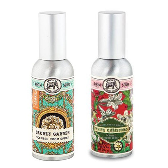 MICHEL DESIGN WORKS (ミシェルデザインワークス)の缶入りホームフレグラントスプレー。サイズ:13.2 x 2.3 x 2.3 cm 重さ:136 g デザイン/香り:シークレットガーデン(香り:ヨーロピアンフローラル)ホワイトクリスマス(香り:ホワイト&グリーンフローラル)