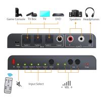 ●リモコン及びスイッチの切り替えで光/同軸デジタル入力を選択できます。リモコンにより電源のON/OFF及びミュートの機能も備えております。