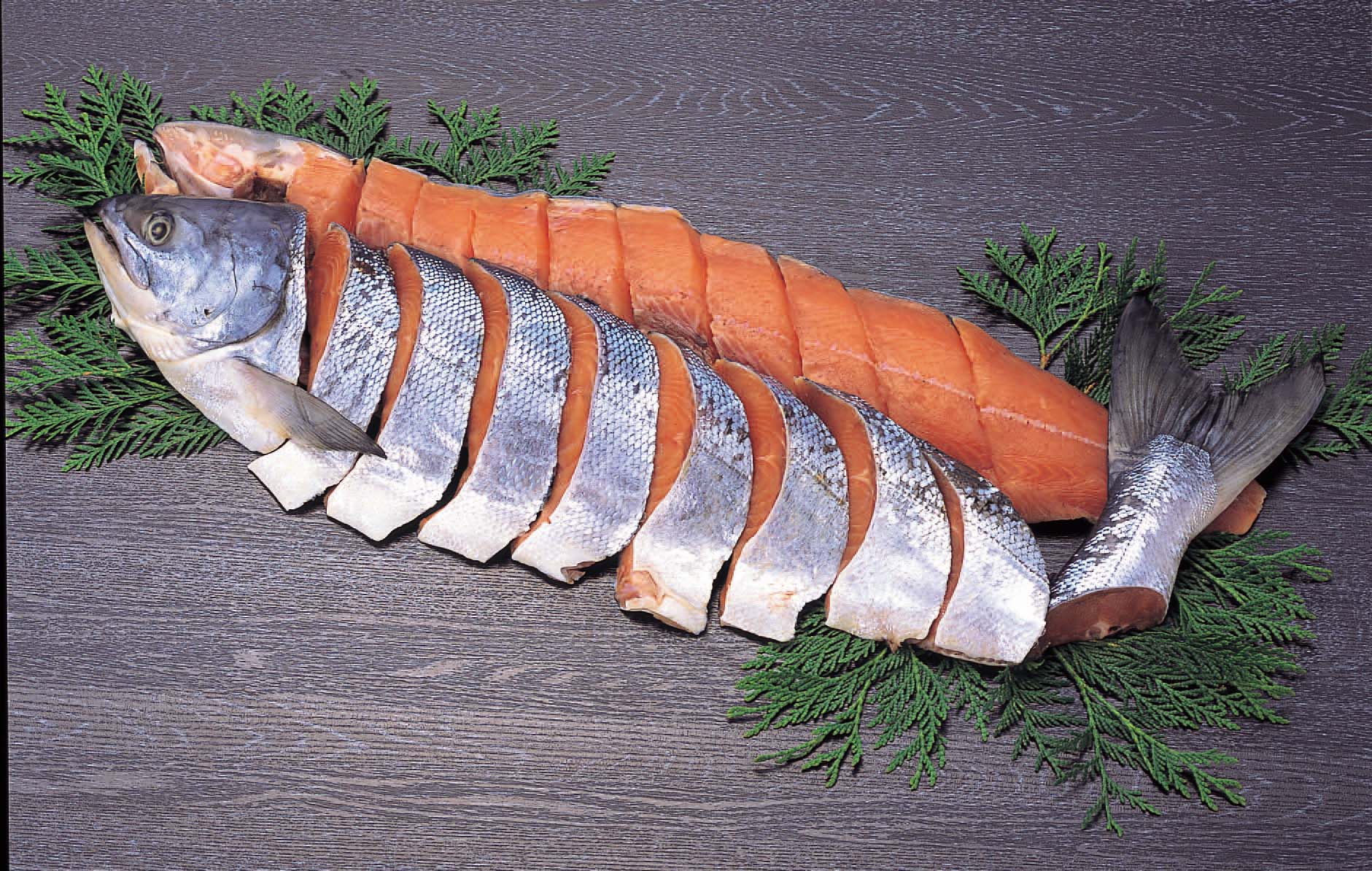 新巻鮭とは、秋鮭の内臓を取り除いて塩漬けにし、干したものです。日本人に最も親しまれてきた鮭のことであり、淡いオレンジ色の身とサッパリとした味わいが特徴的な魚です。
