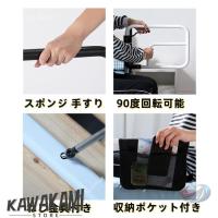 【高さ調整可能 手すり】身体をしっかり支える寝室用手すり。使われている方の体格に合わせて手摺りの高さを76-102cmまで調節。 本体と脚が一体となった構造なので、しっかり安定感があります。小物が収納できるポケットも付きます。