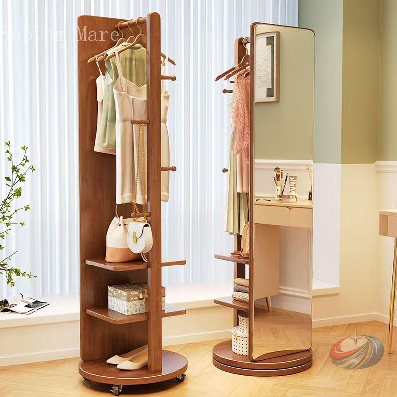 回転式全身ミラー 収納付き ハンガー付き 割れにくい ゾンチー 木製の温かみで空間になじみやすく、姿見と収納を兼ねる便利な全身鏡です