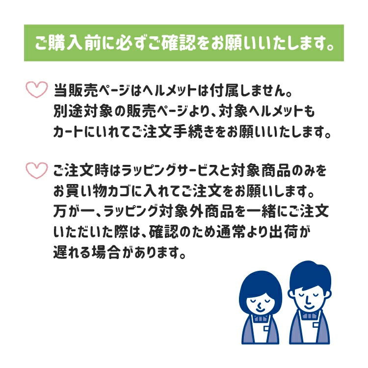 | ◆当商品は対象の箱入りヘルメット専用のラッピングサービス販売ページです。 ◆対象商品は付属していません。別途お買い物かごにいれてご注文お手続きをお願いいたします。 ◆【包装紙について】衝撃に強くありません。お取扱いにはお気を付けください。 ◆ご注文時はラッピングサービスと対象商品のみをお買い物カゴにいれてご注文をお願いします。万が一、ラッピング対象外商品を一緒にご注文いただいた際は、確認のため通常より出荷が遅れる場合があります。 |