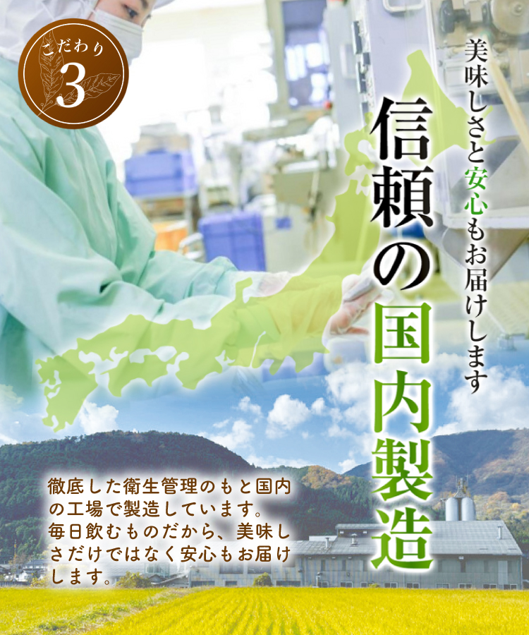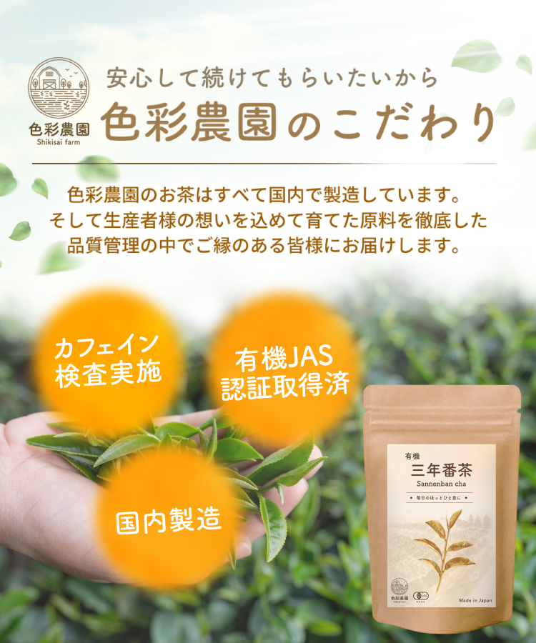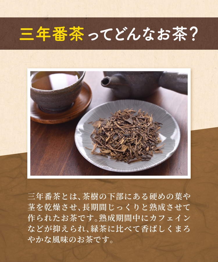 | 商品説明 | 緑茶の茶葉と茎を乾燥させ、長時間熟成期間を経ることで、カフェインなどの刺激物質が緑茶に比べて抑えられ、まろやかな風味になるのが特長です。そんな緑茶を国内で焙煎し有機JAS認証工場で一つひとつ丁寧に充填しました。 【専門機関にてカフェイン検査済み】検査結果:100g中/0.72g |