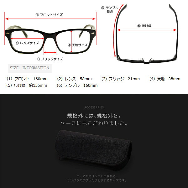 ■ サイズ:レンズ横幅 58 mm、ブリッジ幅 21 mm、テンプル長 160 mm、レンズ縦幅 47 mm、フレーム幅 158 mm