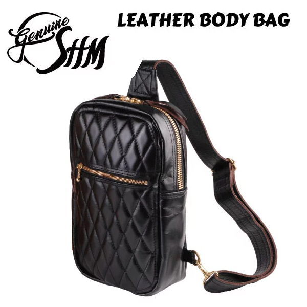 【COOLBIKERSサングラスプレゼント】DIN MARKET 日本製 SHM レザーボディバッグ LEATHER BODY BAG ダイヤモンドステッチ 本革 ブラック