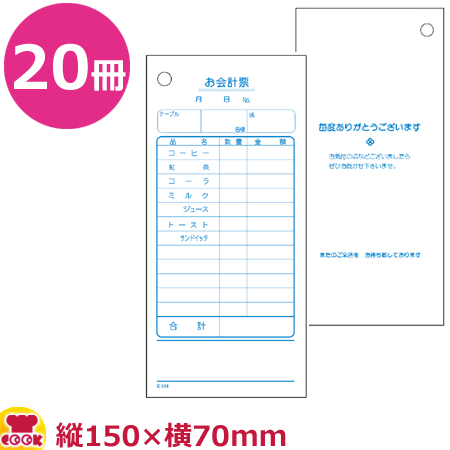 ●お客様のオーダーが一度で決まるお店向きの単式伝票です。●定番メニューのオーダー頻度が高い場合、メニューの記入を省くためにあらかじめ品名が印刷されています。●100枚ごとに表紙と裏ボールが付いていて、のりづけ製本されています。【cookcook、クッククック、インテリア、店舗備品、会計伝票、大黒工業、原産地:日本、K-404、4975139556635、201005、伝票、会計、1枚、だいこく、ダイコク】