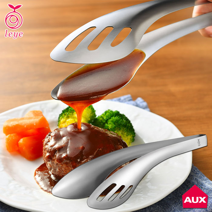 食材を包み込むようにつかみ、大振りな食材もしっかりつかめます。包み込むようにつかめる形状。しならないので大振りな食材や丸く滑りやすい食材もガッシリつかめます。 大きな食材だけでなく、パスタ一本つかむような繊細な作業もできます。 片側が深くなっていてソースをすくえるので、調理や盛り付けのちょこっとソースがけに便利です。約大さじ1杯分すくえます。 穴の形状、大きさに拘りました。すくったソースが良く見えやすく、かけやすいです。 十分なハンドル長さがあるので加熱調理でも熱くなりにくく安心です。 スタイリッシュなデザインと清潔感を保てるステンレス製。食洗機でのお手入れも可能です。 逆さに置けばテーブルが汚れないので、調理中でもサッと置けます。 | |
