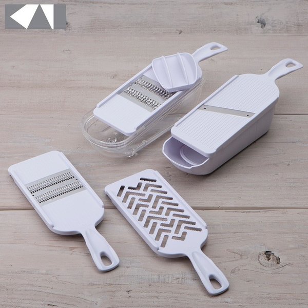 刃物メーカーならではの切れ味のよさを味わえるスライサー、せん切り器、細千切り器、おろし器の4つの調理プレートと指ガードをコンパクトに収納できるセット。 ふたとケースが受け皿として使えるので、同時にふたつの調理器が使えます。 |