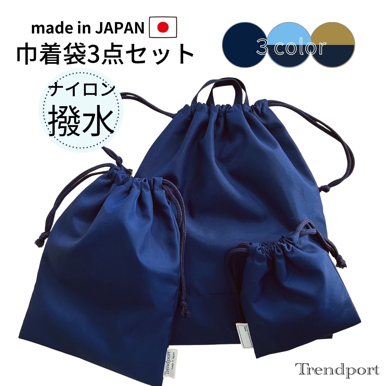 巾着袋 セット 防水 無地 3点 大 中 小 撥水 ナイロン 子供 日本製 ネイビー 体操着 上履き入れ コップ入れ 靴袋 幼稚園 小学校 保育園 大きめ 大人