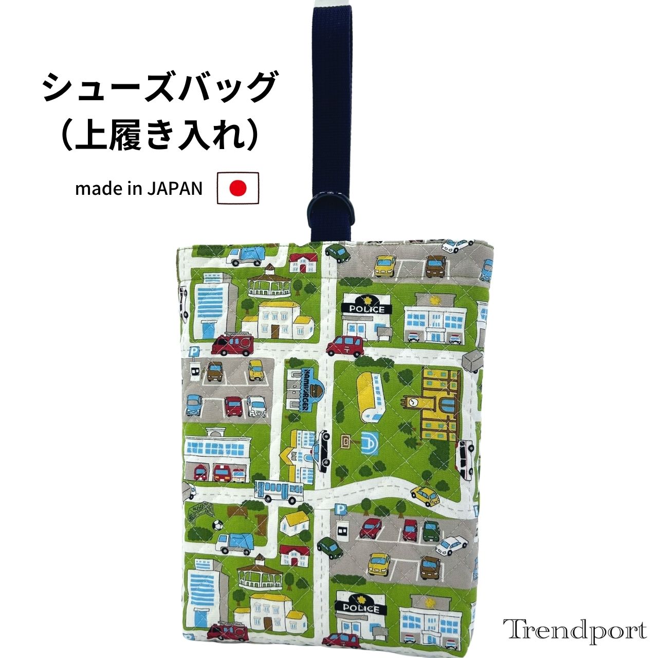 上履き入れ シューズバッグ くるま と道路 グリーン 男の子 キルティング シューズケース 保育園 幼稚園 小学校 日本製 綿 子供