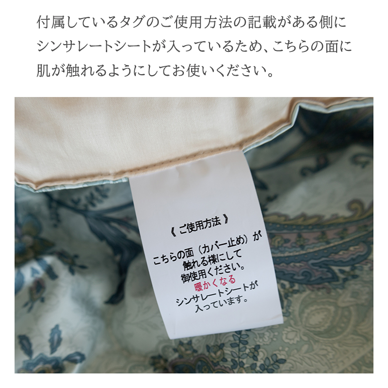 | ■シンサレートのおまかせ柄あったか掛け布団。 ■通常のシンサレートよりもグレードの高いシンサレートUltraを使用。シンサレートの厚みと密度が増えて、より暖かい。 ■家庭の洗濯機で丸洗い可能!乾燥機のご使用はお避け下さい。 ■安心安全の日本製。 |