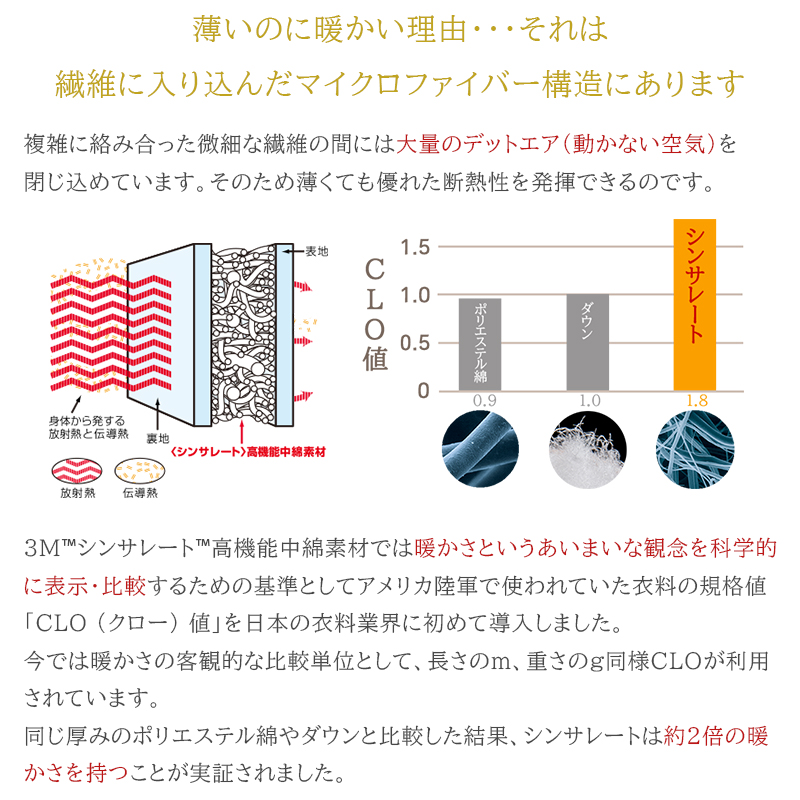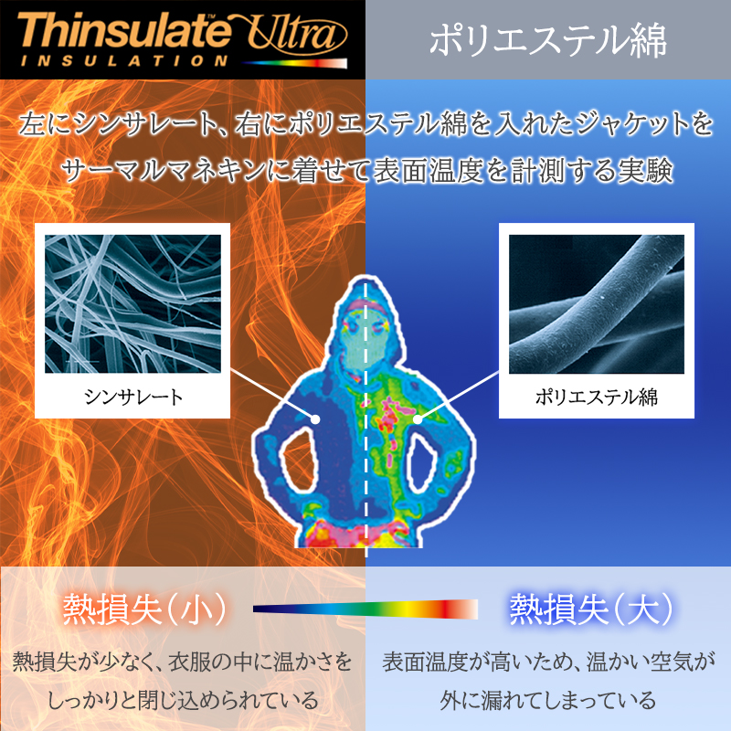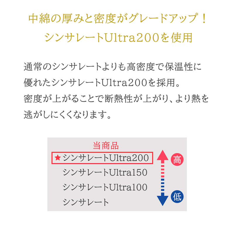 | 素材 | 側生地 ポリエステル80% 綿20% 詰め物 中綿:ポリエステル100% シート:ポリエステル55% ポリプロピレン45% (シンサレートUltra200使用) | |