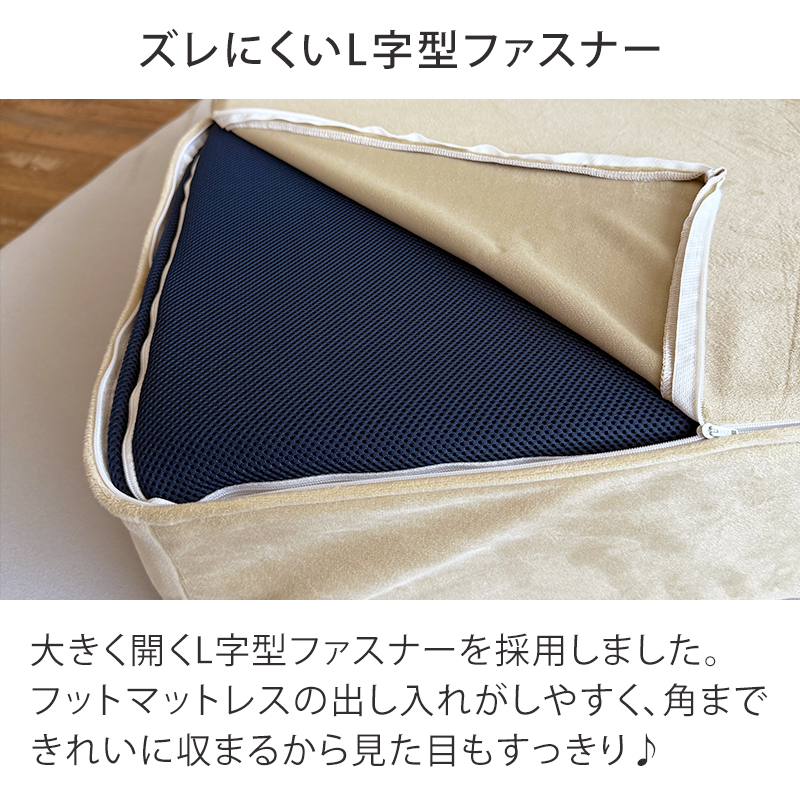 すっぽりと収納できるL字型ファスナーなので、簡単に着脱できます。フットマットレスにきれいに収まるので見た目もスッキリです。