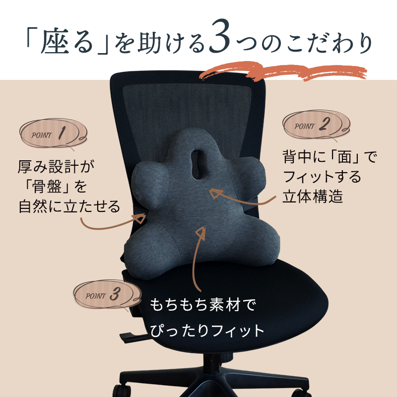 もちもち素材でフィットし、長時間座っても崩れず安定。
