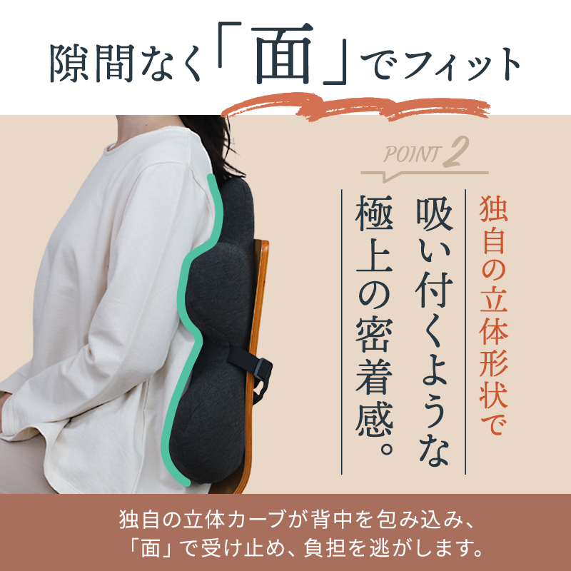 独自の立体カーブが背中を覆い、「面」で受け止め負担を軽減。