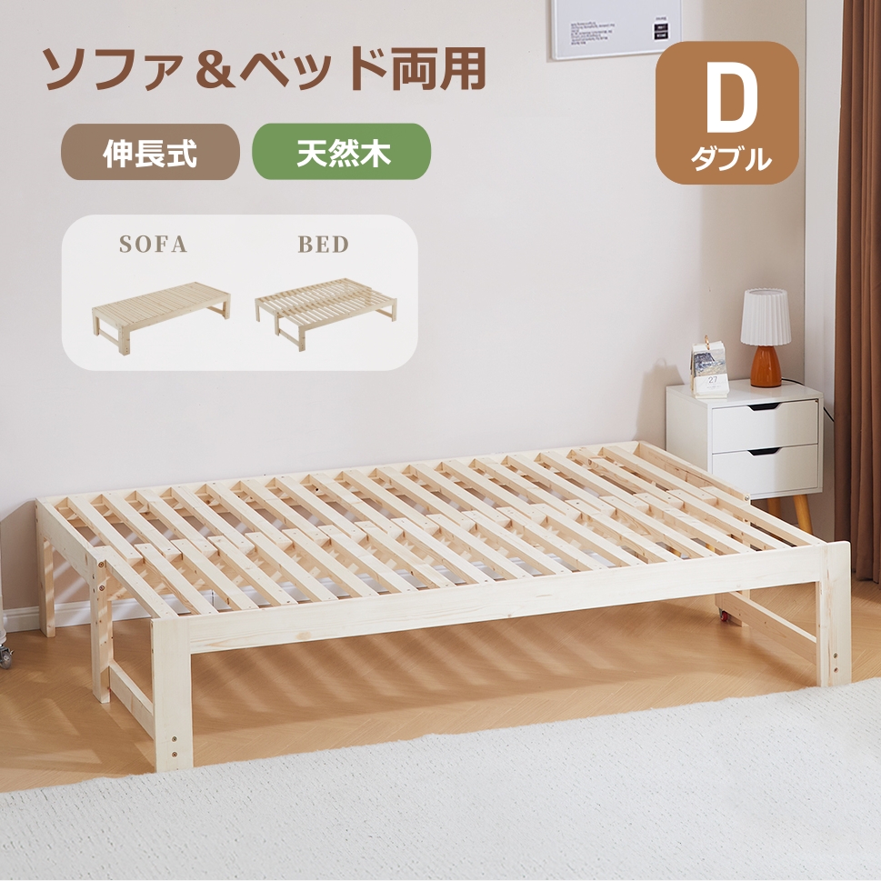 すのこベッド ベッドフレーム D ダブル ソファベッド ディベッド 木製 伸長式ベッド 2way 無塗装 天然無垢材