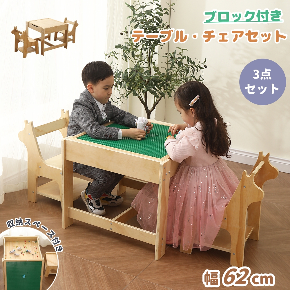 子供用テーブル チェアセット ブロックテーブル 子供机 テーブルセット 3点セット 収納付き 多機能 プレイ 知育 勉強 絵かき ブロック遊び プレゼント