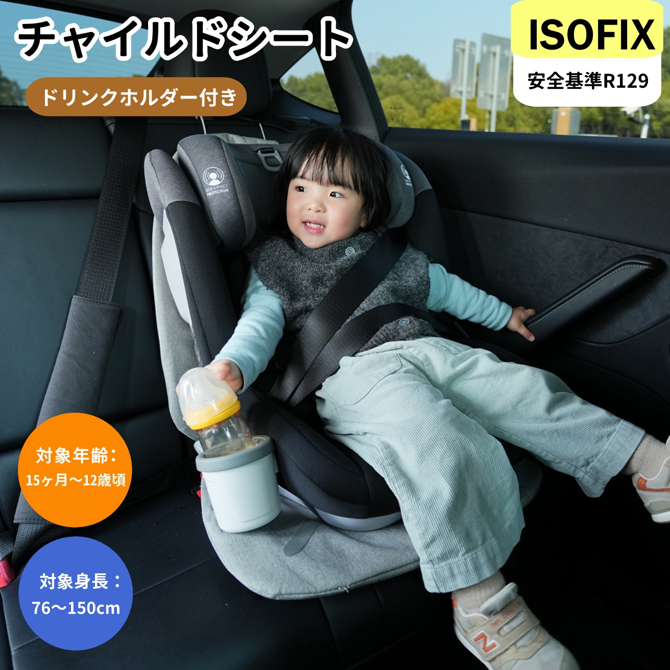 チャイルドシート 新生児 ISOFIX R129適合 15ヶ月-12歳頃 76-150cm ジュニアシート 長く使える 取付簡単 ドリンクホルダー付き 出産祝い 赤ちゃん