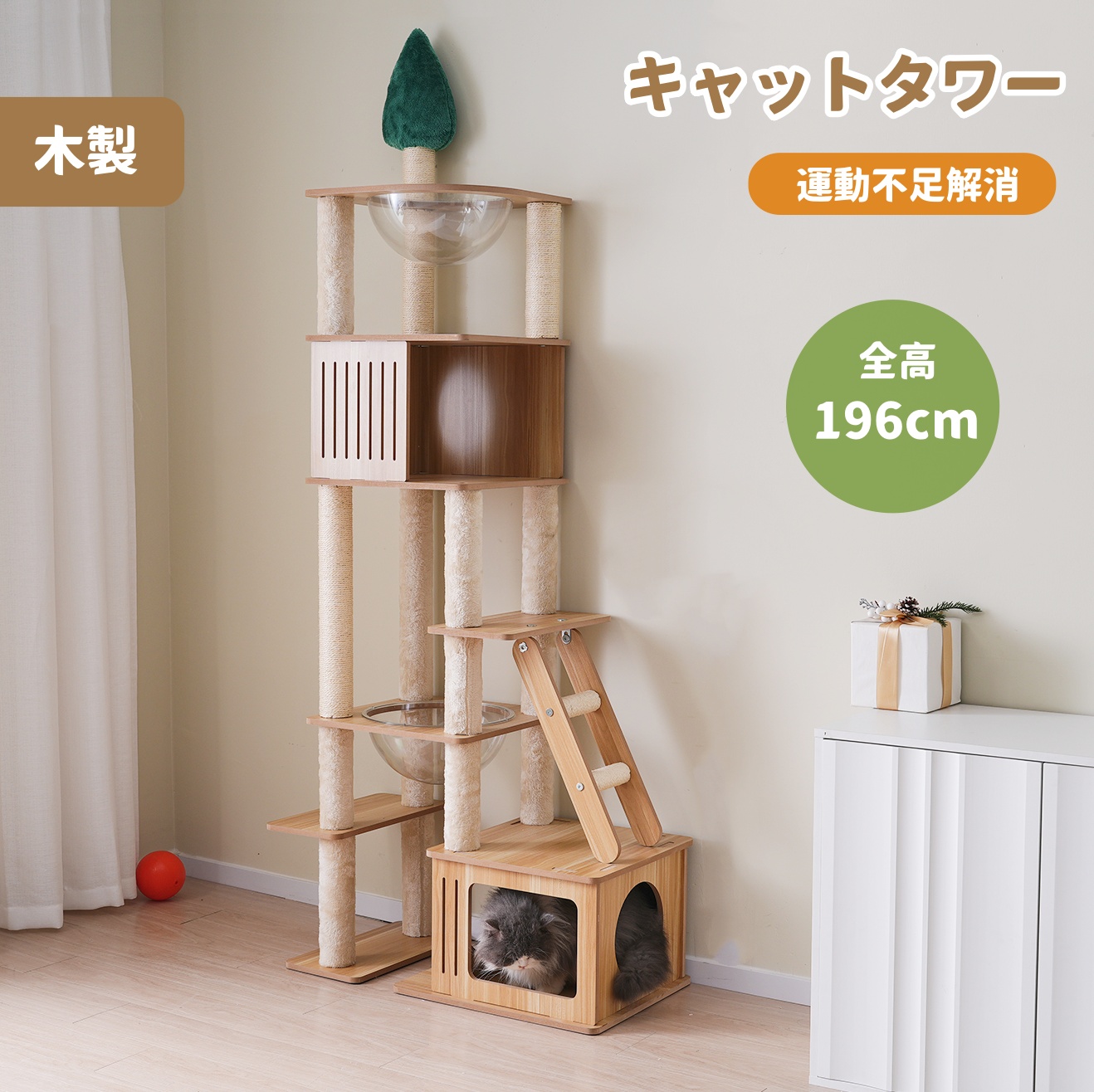 【5%引クーポン利用!】キャットタワー 多頭飼い 大型 木製 据え置き 全高196cm 麻紐 宇宙船 ハンモック付き 隠れ家 展望台 麻紐 猫