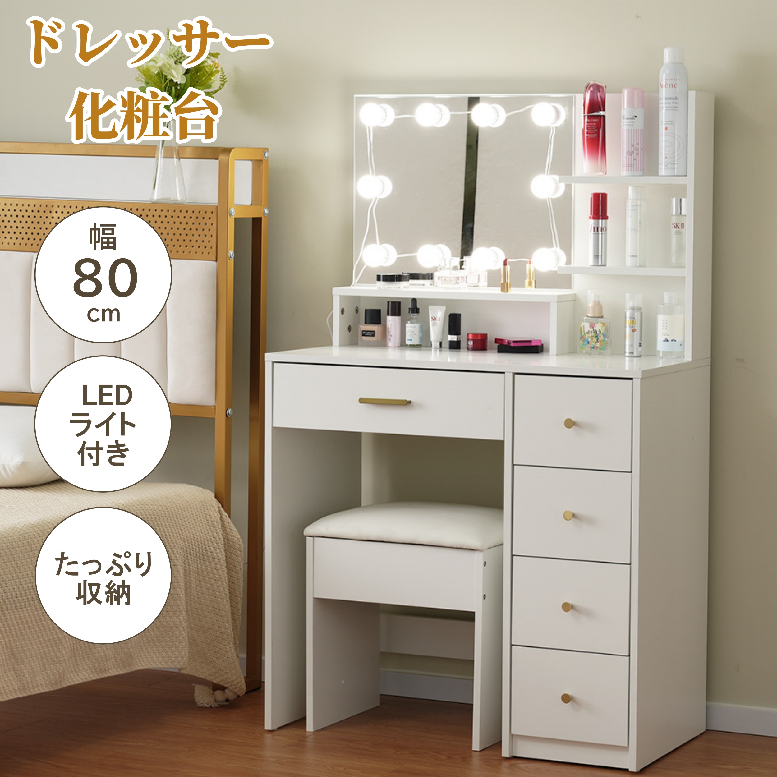 ドレッサー 化粧台 テーブル 幅80cm コンパクト 鏡台 LEDライト付き スツール付き 引き出し 収納 サイド収納