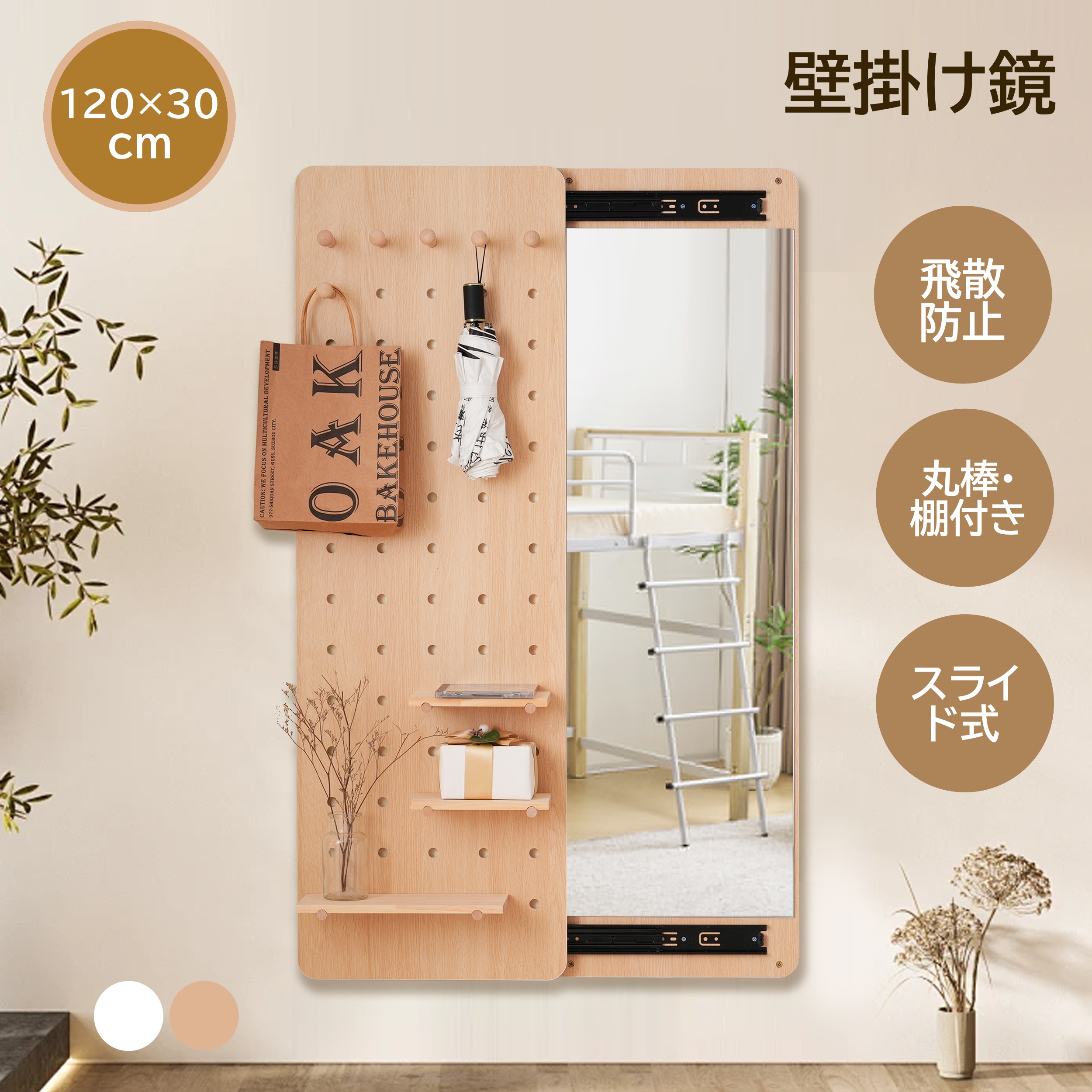 【新春ファーストデイ!全店5%引クーポン!】壁掛け鏡 120×30cm 全身鏡 玄関 寝室 姿見鏡 おしゃれ 収納ボード付き ミラーが隠せる 有孔ボード ペグボー