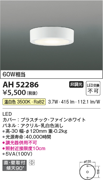 コイズミ照明 AH52286 薄型シーリングライト LED一体型 直・壁取付 傾斜天井対応 非調光 温白色 ファインホワイト