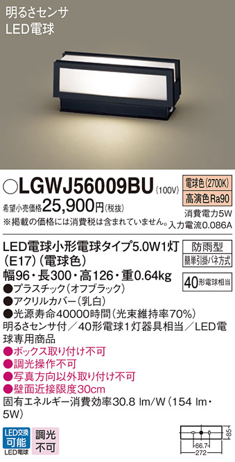 パナソニック LGWJ56009BU エクステリア 門柱灯 ランプ同梱 LED(電球色) 据置取付型 明るさセンサ付 オフブラック