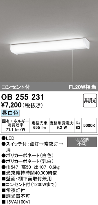 オーデリック OB255231 LEDキッチンライト LED一体型 非調光 昼白色 コンセント付 常夜灯付 壁面・棚下面取付兼用