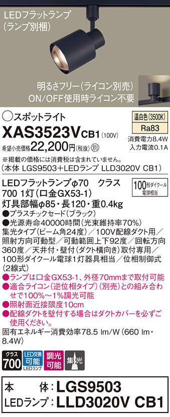パナソニック XAS3523VCB1(ランプ別梱) スポットライト 配線ダクト取付型 LED(温白色) 集光24度 調光(ライコン別売) ブラック