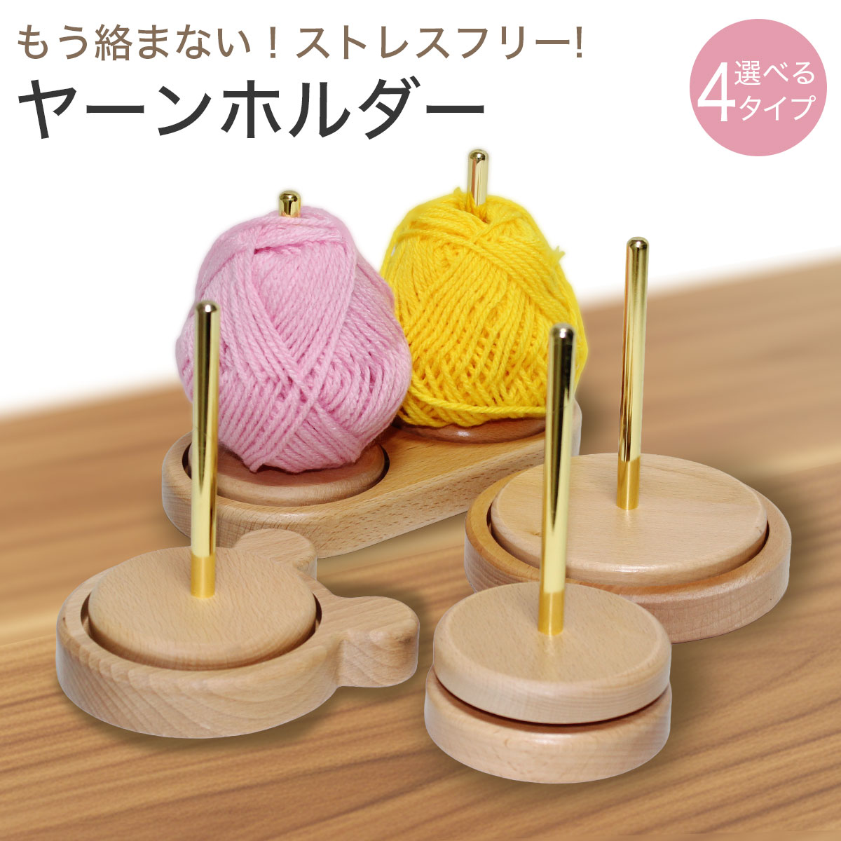 「ヤーンホルダー」は、毛糸玉をしっかり固定し、スムーズな糸引きと快適な作業環境を叶える木製の糸立てです。